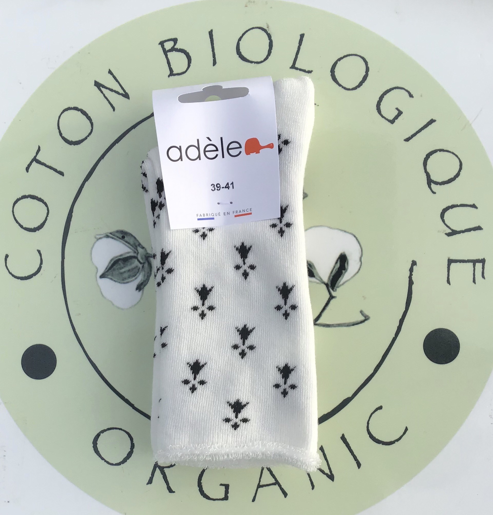 Chaussettes en bouclettes de coton bio GOTS blanc avec des hermines noires sur la tige.