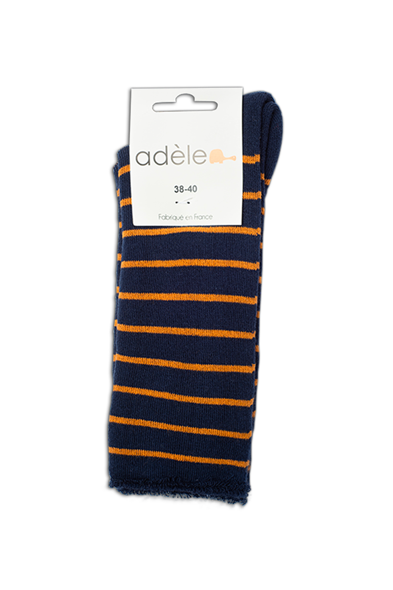 Chaussettes en bouclettes de coton biologique de couleur Marine avec des rayures Ocre